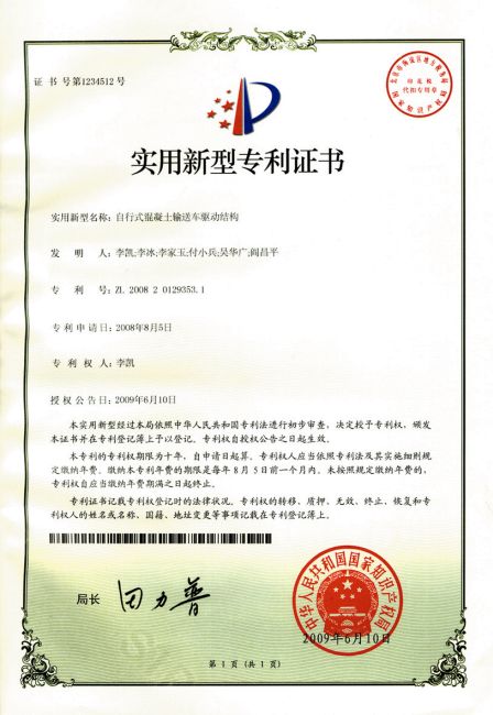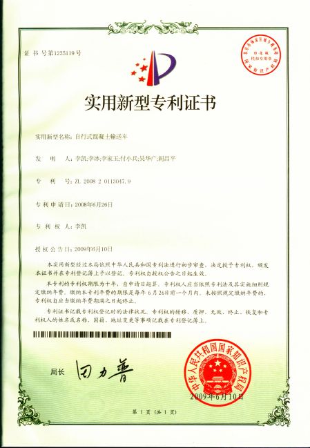 (1)Пять национальных патентов на модель для Передвижной бетоносмеситель (колесно-рельсовый)